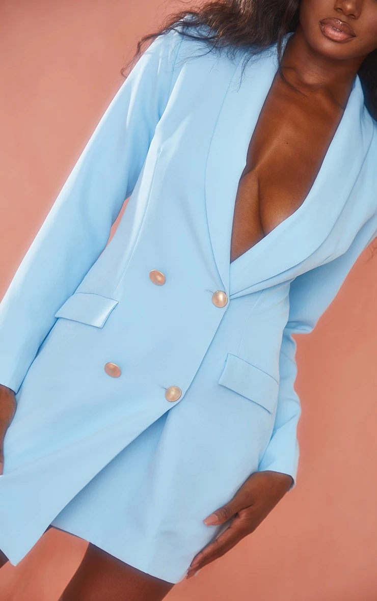 Got a special occasion to attend? Then look no further than this baby blue gold button blazer dress, it’s the perfect piece to have all eyes on you this season. This tuxedo dress is a must right now and we are obsessed, this style of smart dress is perfect for that special event in your diary. You can wear this blue blazer dress with matching heeled mules, large gold hoops and a ruched shoulder bag to complete the look.