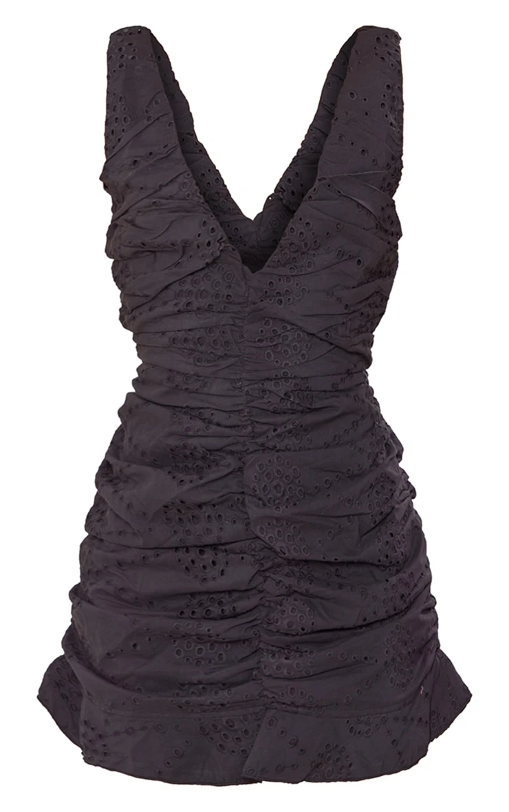 Every doll needs a little black dress in their wardrobe and this black broderie plunge ruched frill hem bodycon dress is sure to be your new go to whatever your plans. It features a black broderie material with a ruched frill hem design and a plunged neckline, it’s a definite yes from us. Style this bodycon dress with clear slip-on heels and gold hoop earrings for a look that is perfect for your next date night and beyond.