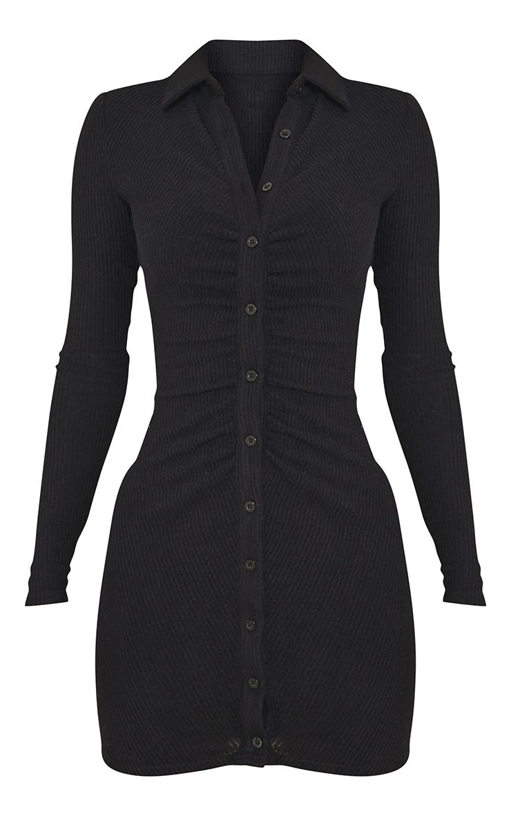 Your weekend wardrobe is in need of this black brushed rib ruched long-sleeve shirt dress. Its black brushed rib material adds all the comfy vibes to your weekend look whilst its ruched detailing is super flattering. This shirt dress gives your weekend plans a chic finish and elevates your vibe to a new level. Pair with heeled boots, a mini bag and your fave accessories for a vibe that won’t go unnoticed.