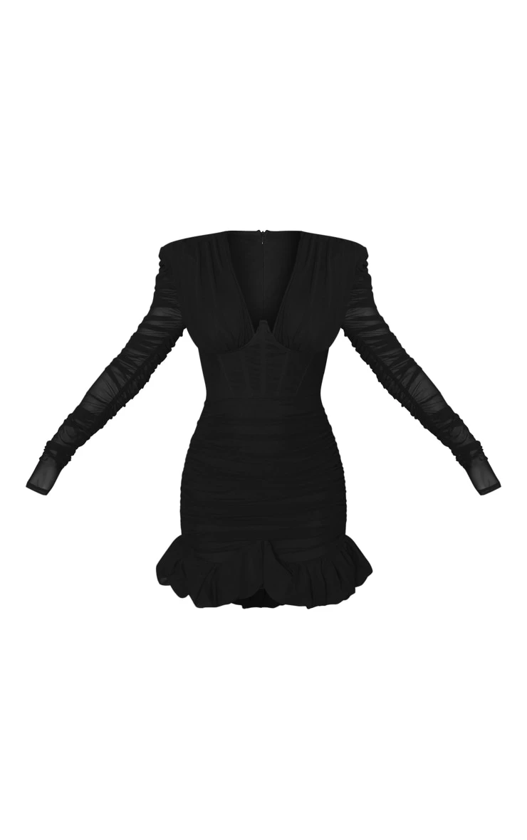 Hit refresh on your weekend wardrobe with this black ruched mesh corset detail puff hem bodycon dress. This dress is made from a black hue with a ruched mesh material, what’s not to love? With a corset detail and a puff hem design, this dress is sure to be the answer to all your weekend styling dilemmas. Simply style with some clear heels and minimal accessories to complete the look.