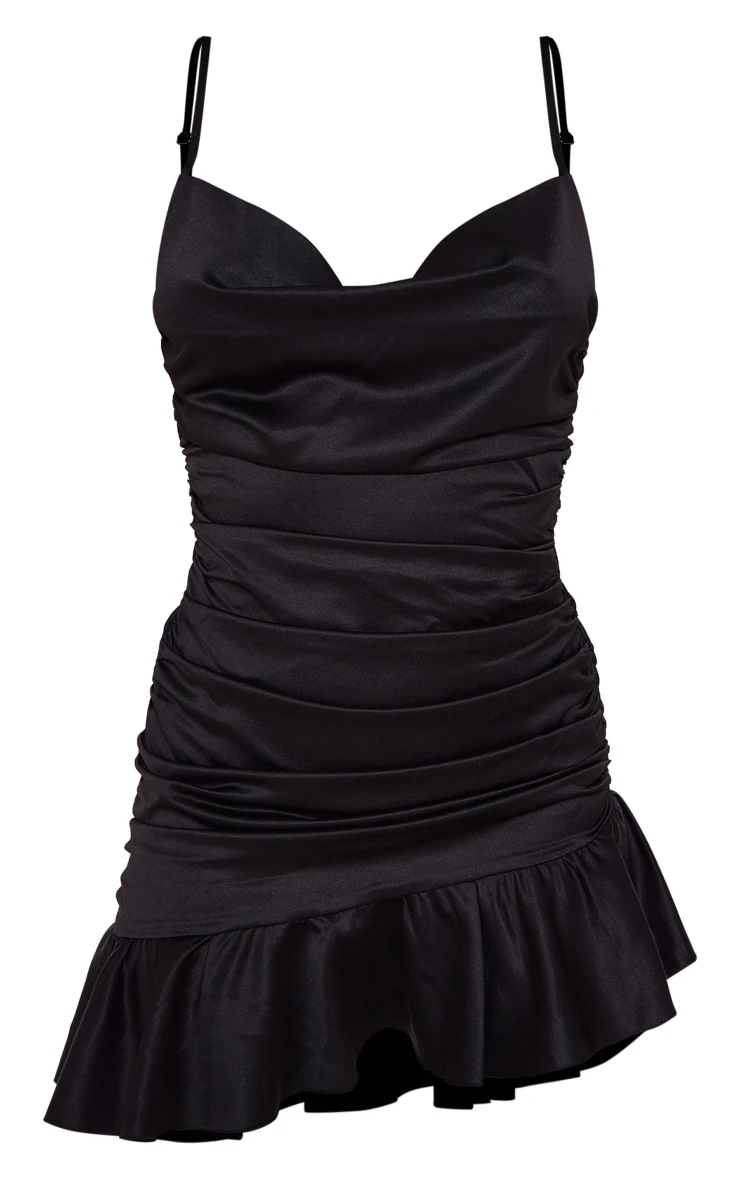 Make a statement this season with this black satin cowl ruched frill hem strappy bodycon dress. This dreamy dress will have you feeling glam all season and beyond. With a black hue and a satin material, this dress is bringing all the luxe vibes to your wardrobe. Swap your usual little black dress for this one doll, you won’t regret it. Team with some clear heels and your fave accessories to take your look to new heights.