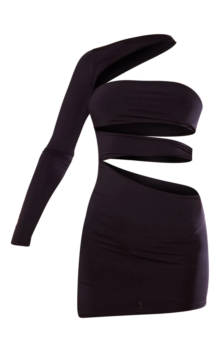Your what-to-wear dilemmas this weekend have finally been answered with this black slinky one-shoulder cut-out mini dress. Embrace your daring side with this mini dress doll and be sure to impress no matter what your weekend plans are. It features a black slinky material with a one-shoulder design and multiple cut-outs to show off your unreal figure. Simply style with knee-high-heeled boots, a shoulder bag, and gold accessories for a flawless finish.