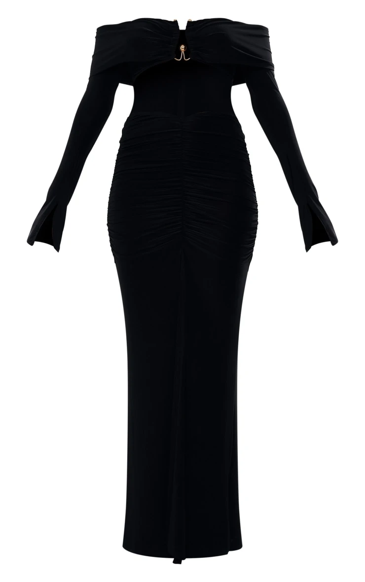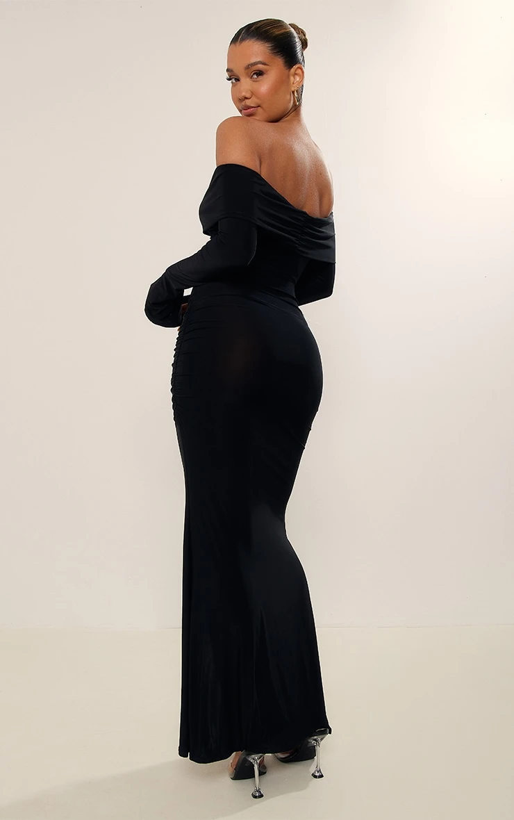 Be sure to impress this weekend with this black slinky trim detail bardot cut out maxi dress. This maxi dress is the perfect choice for that romantic date night planned with its black slinky material helping show off your unreal figure and its trim detail adding a touch of luxe. Its cut-out detail and bardot neckline will have you stealing all the stares. Pair with strappy heels and gold accessories to complete this look.