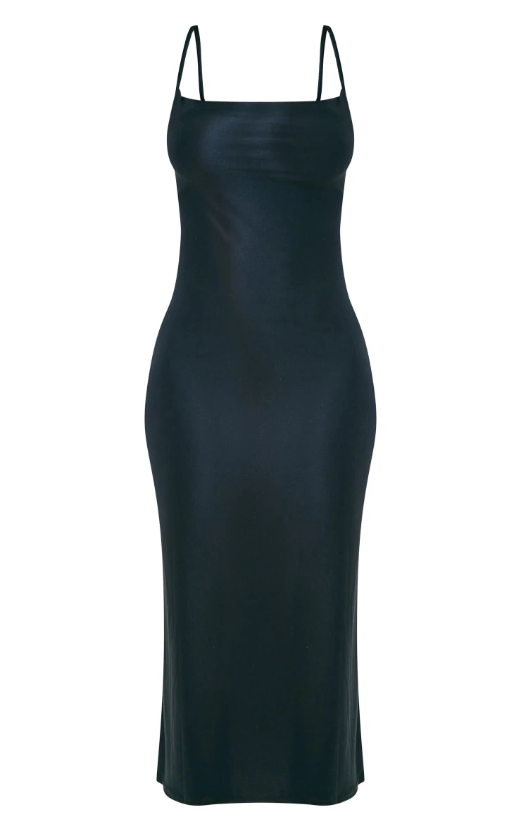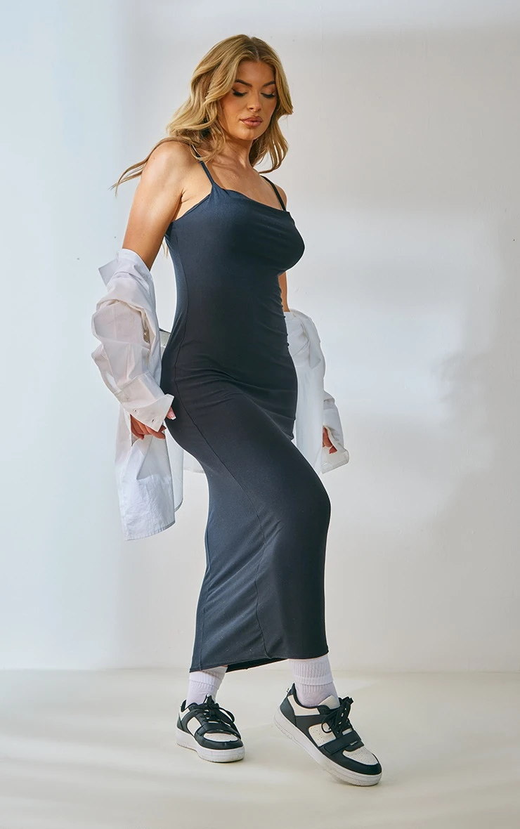 Make everyday styling simple with this black soft touch strappy scoop neck midaxi dress. Brought to you in a black soft touch material with a strappy design, a scoop neck and a midaxi length, how could you say no to this doll? To level up the look style this women’s midaxi dress with box-fresh trainers, an oversized shirt and accessories for a flawless finish.