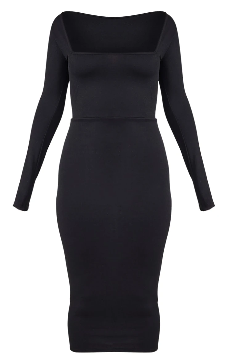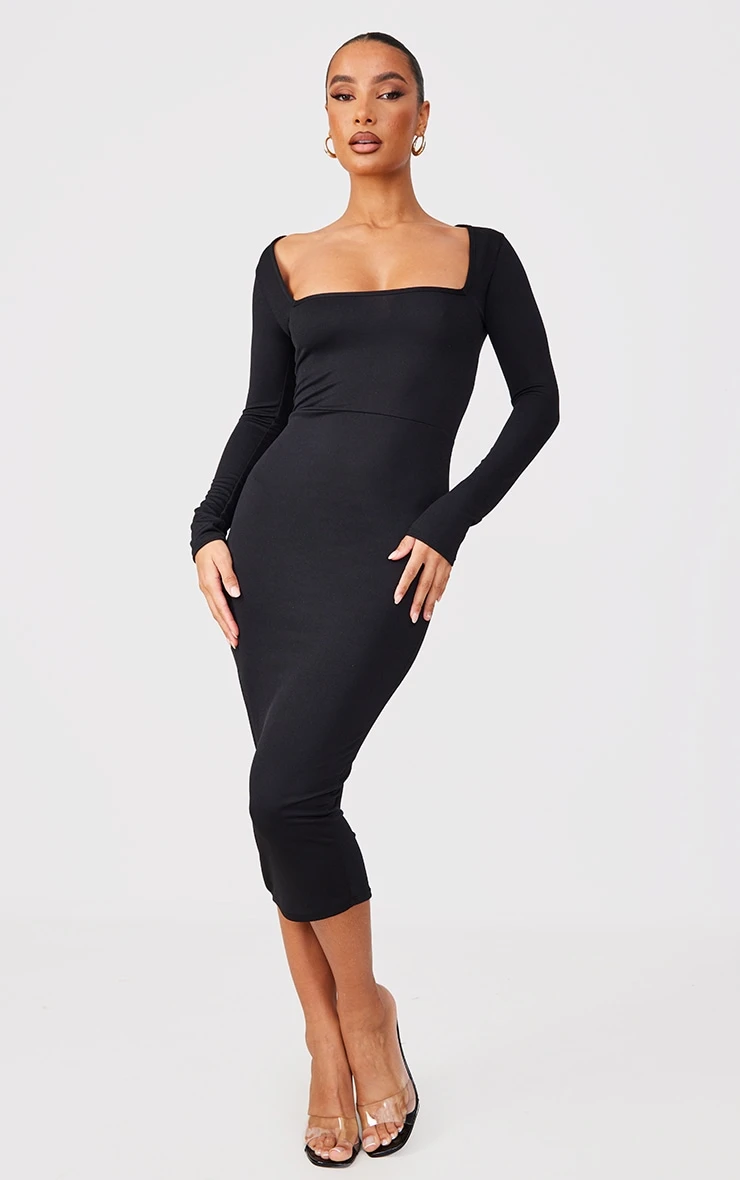 Simple but essential, this midaxi dress is perfect for flattering your shape. Featuring a black fabric with a flattering square neck and long sleeves. Simply team this dress with your fave accessories and strappy heels.
