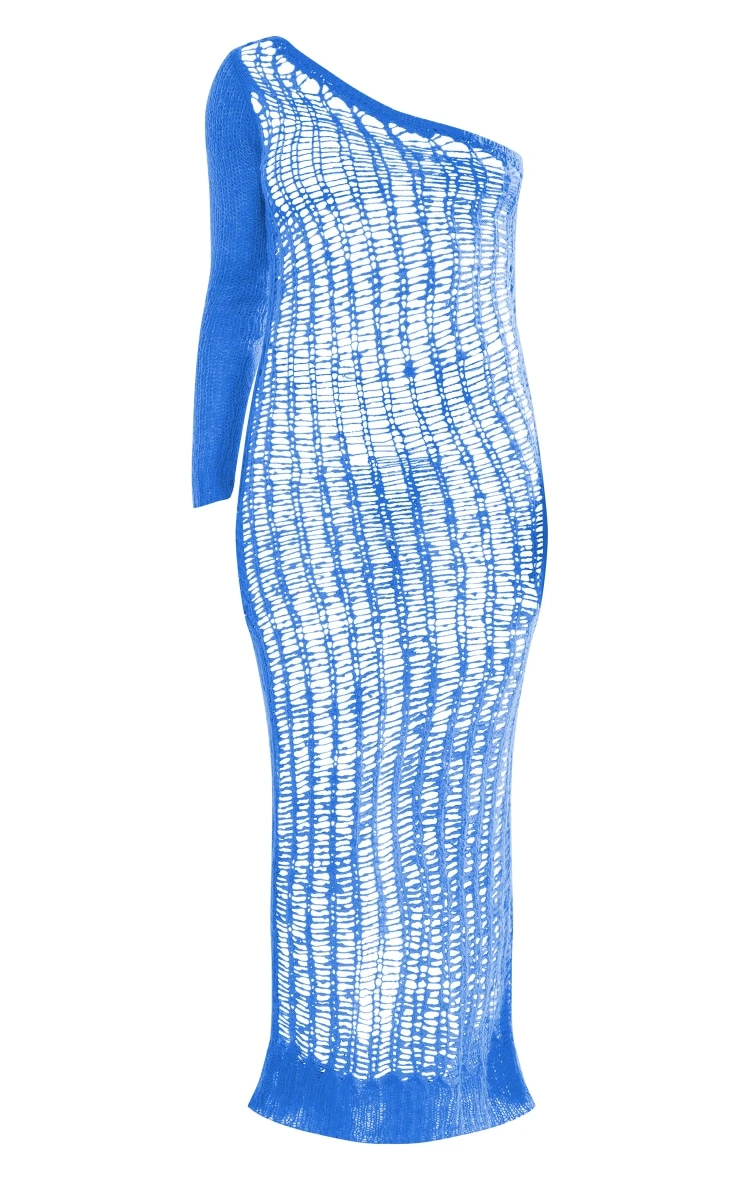 Add some drama into your vacay wardrobe with this bright blue distressed open knit one sleeve midaxi dress. Brought to you in a bright blue knit material in a distressed design, we are seriously obsessed. With its one sleeve fit and midaxi length, you’re sure to have all eyes on you. To complete the look style with some clear heels and your fave bikini to finish this vacay look we are loving.