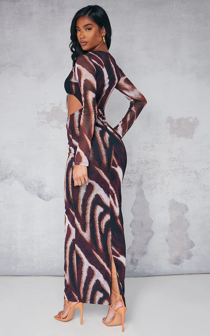 Your weekend look is finally found with this dress doll. Featuring a brown animal mesh print amterial with cup detailing, long sleeves and a maxi length, what’s not to love? Add your dreamy high heels and gold accessories to complete this must-have look.