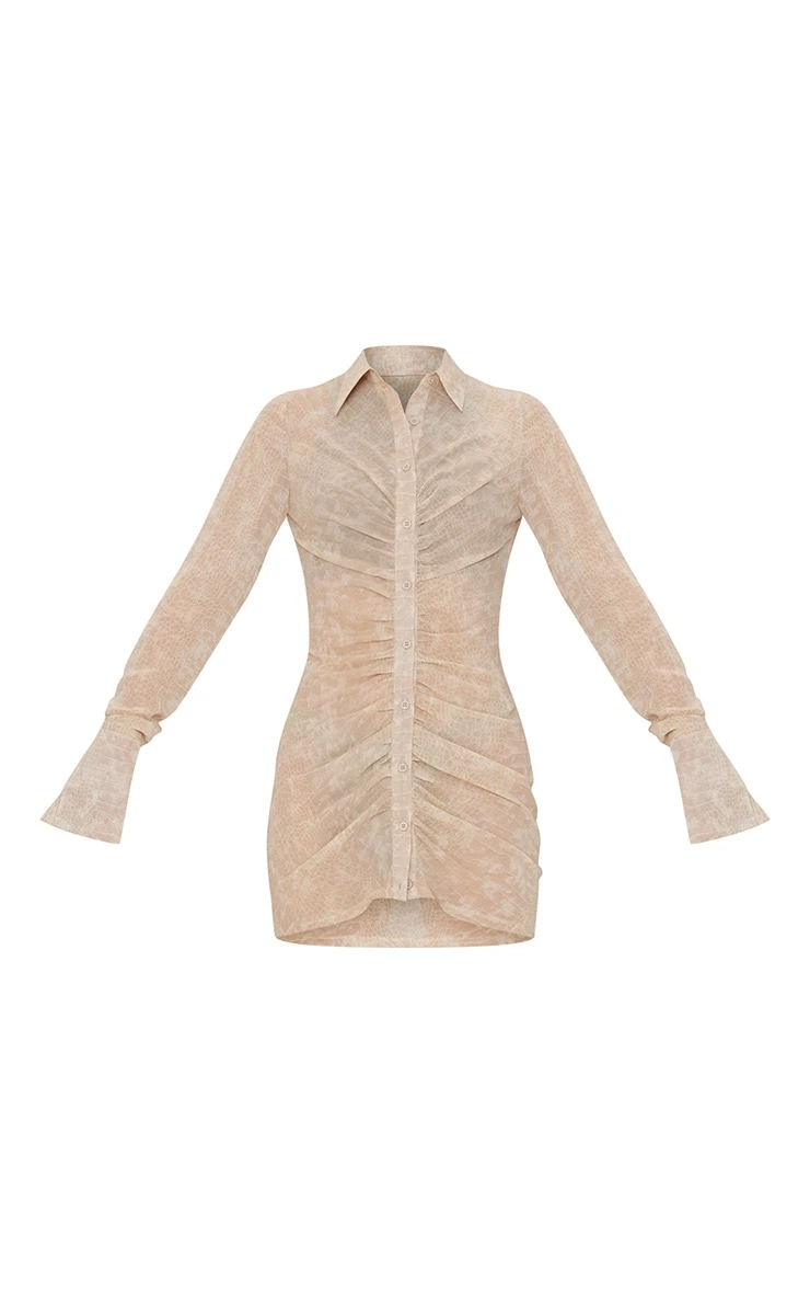 Get ready to look seriously chic in this bodycon dress. Featuring a cream material with a croc print, a button down front and a ruched design. We are loving this with knee length boots and a coat to complete the look.