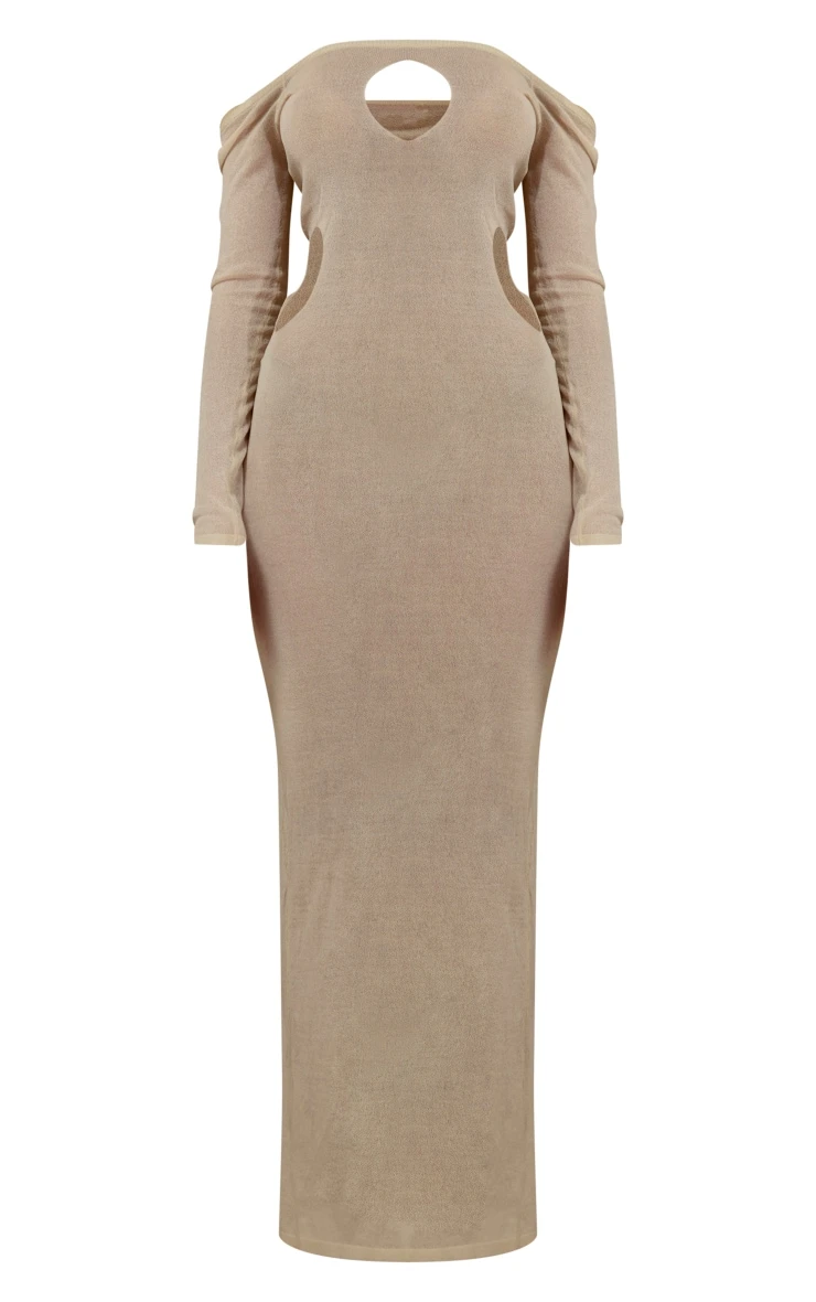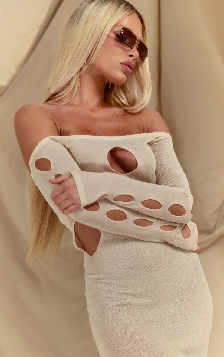 Bring all the luxe vibes to your weekend look with this cream sheer knit cut out long sleeve maxi dress. Its cream sheer knit material adds some cosy feels to your look as well as expresses your daring side. This maxi dress also features cut-out details and a bardot neckline which gives you that chic touch. Team with heeled mules and gold accessories for a vibe that won’t go unnoticed.