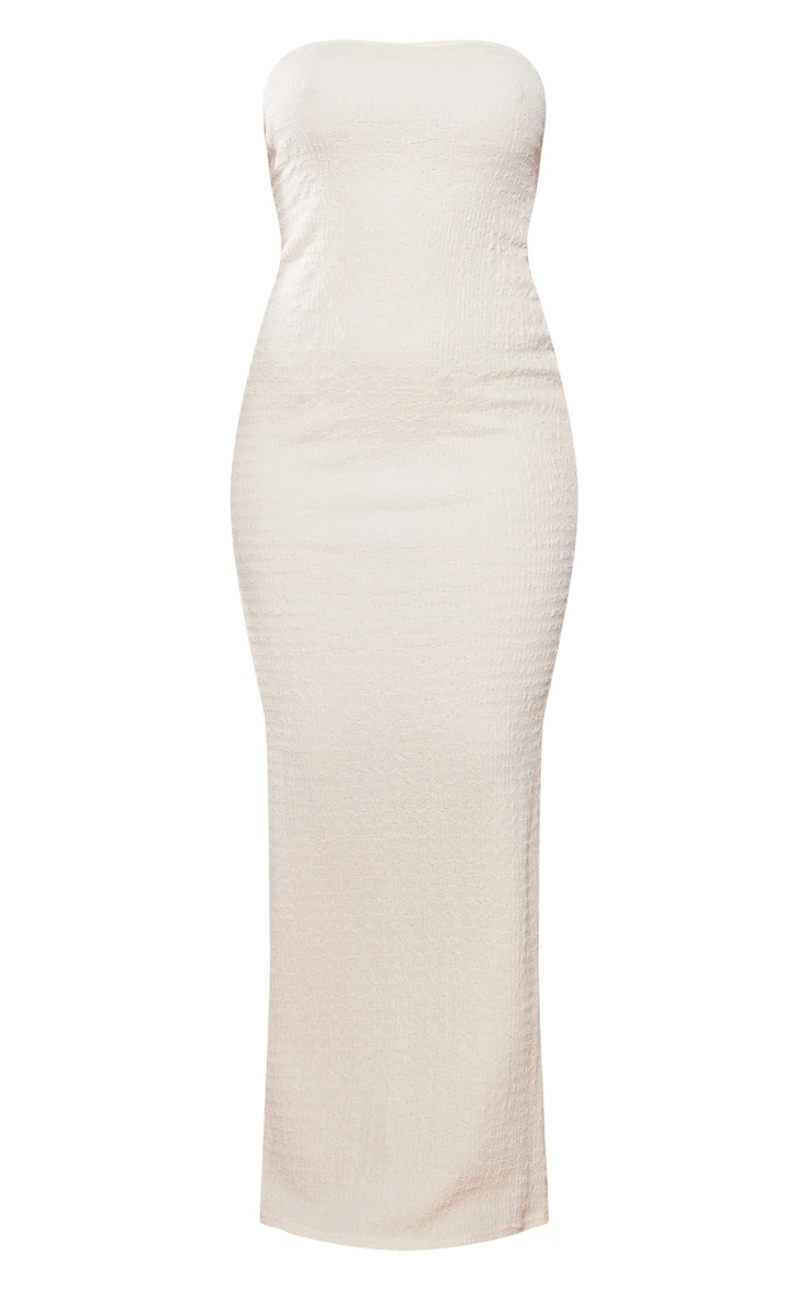 Add some dreamy vibes to your weekend look with this cream-textured detail bandeau maxi dress and be sure to earn all the compliments. Made from a cream textured material with a bandeau neckline and a figure-hugging fit, what’s not to love? Whether you have an upcoming special occasion or a date night in the diary, this maxi dress is exactly what you need. Style effortlessly with clear heels and gold accessories for a flawless finish.