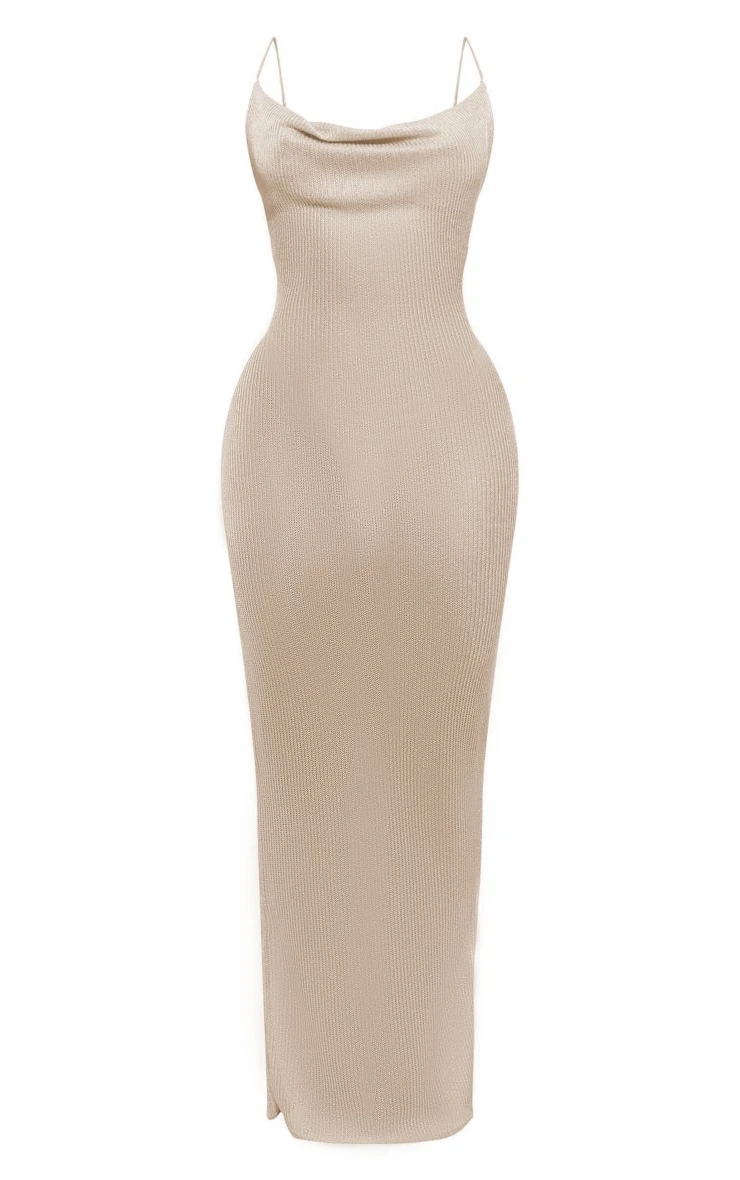 Get ready to show off your glam side in this dreamy gold metallic thread cowl strappy maxi dress, you’re sure to have heads turning for all the right reasons. This dress features a gold metallic thread material with a cowl neck design and a maxi length, we’re seriously obsessed doll. Pair this maxi dress with clear slip-on heels and your fave accessories for a look that is perfect for your next date night and beyond.