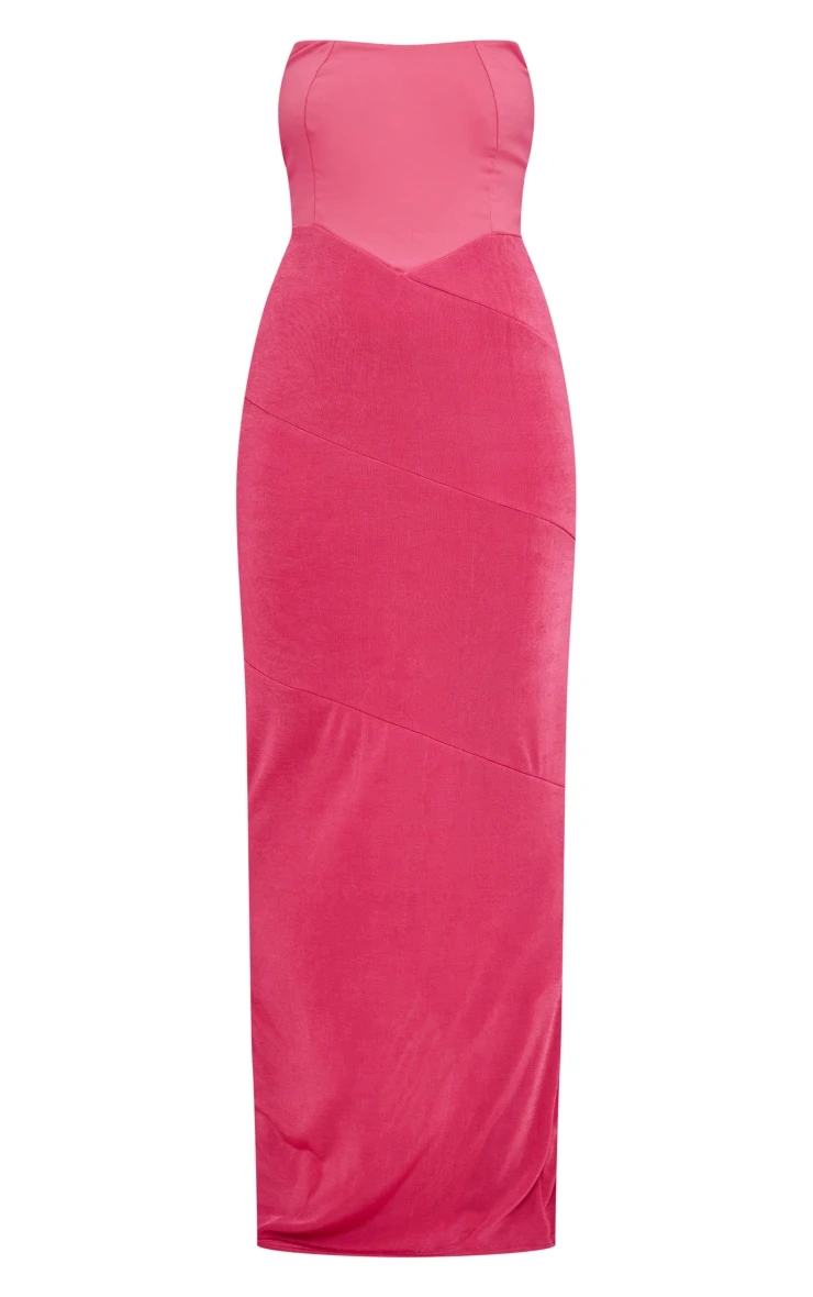 Stand out from the crowd in this hot pink acetate slinky contrast bandeau maxi dress. Brought to you in an eye-catching hot pink hue acetate slinky material with a bandeau neckline and a maxi length, what more could you want? This figure-flattering dress is perfect for your next occasion doll. We are loving this styled with some glam heels and statement accessories for a show stopping look that will have everyone looking your way doll.