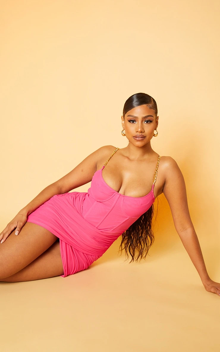 Bring some drama to your weekend wardrobe with this unreal dress. Featuring a hot pink material with corset detailing and chain straps, we’re obsessed. Style with strappy heels and hoop earrings for a night with the dolls.