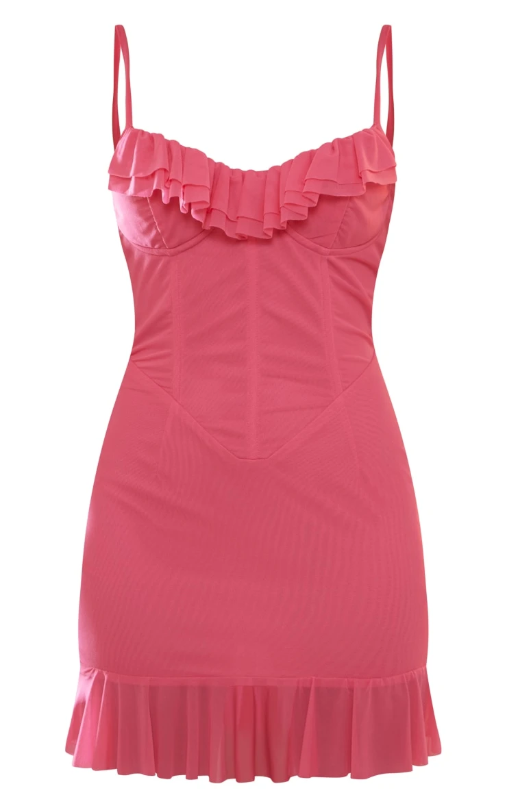 Look all kinds of glam in this hot pink mesh corset frill trim detail strappy bodycon dress. This unreal dress is made from a mesh material with a corset design for a flattering fit that will have you standing out whatever the occasion. With a frill trim detail, this bodycon dress is a must have. Team with some silver heels and your go-to accessories to complete the look.