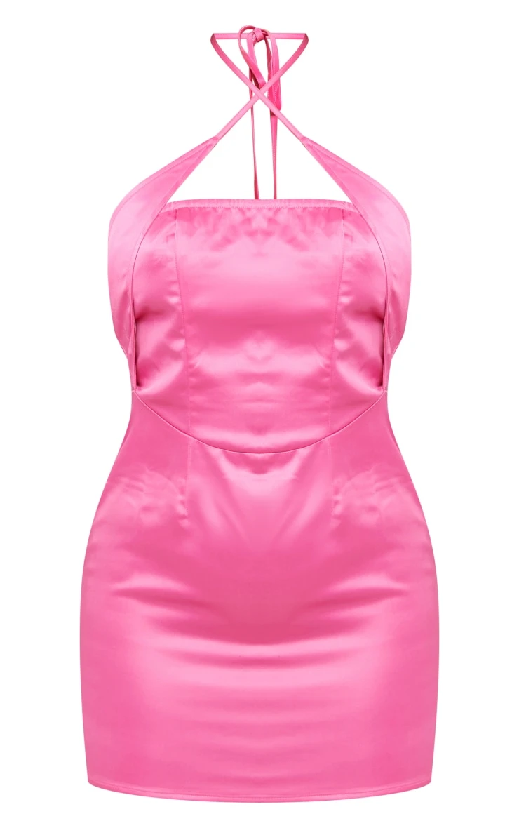 Make a statement in this hot pink satin cross neck detail bodycon dress. This dress is brought to you in a hot pink satin material for a touch of luxe. With a cross neck detail and a bodycon fit, what more could you want doll? Whether you have brunch plans with the dolls or date night with your significant other, you will be turning heads. Team with some of your highest heels and a pair of gold hoops to elevate the look even further.