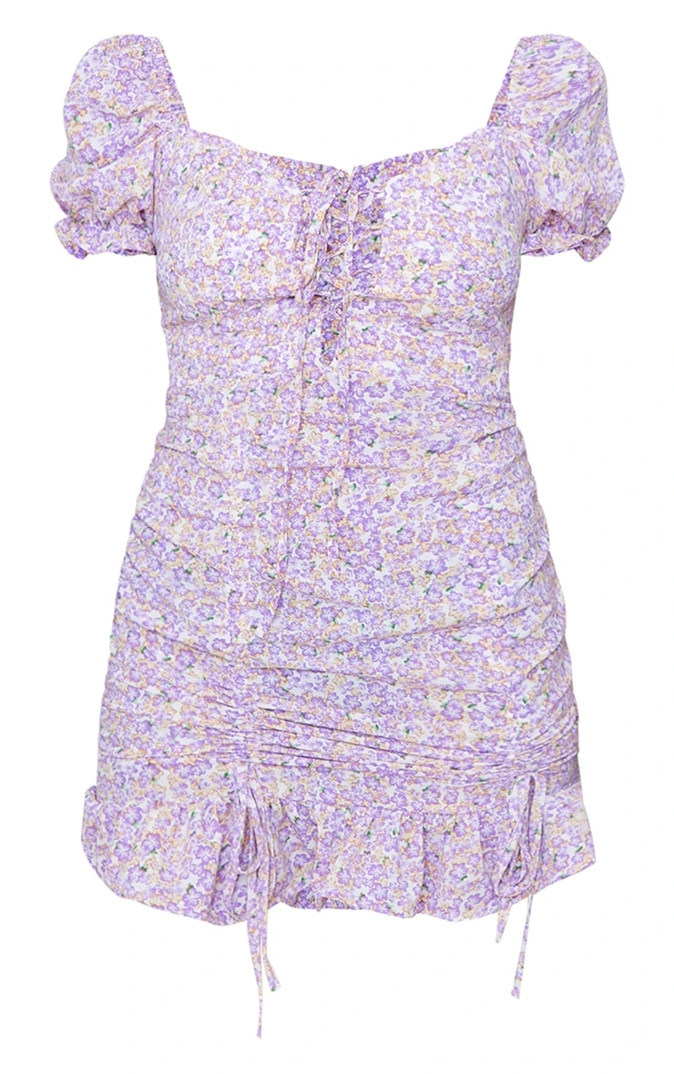 Lilac Ditsy Floral Print Ruched Puff Sleeve Bodycon Dress