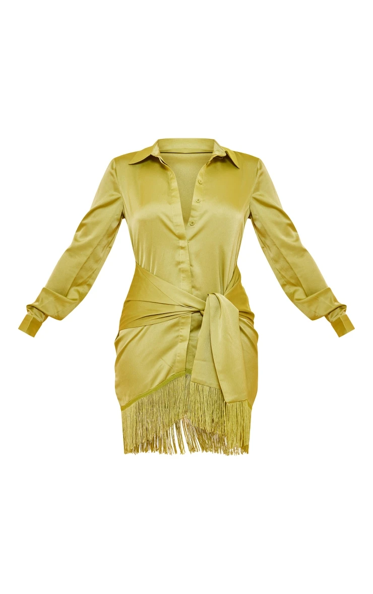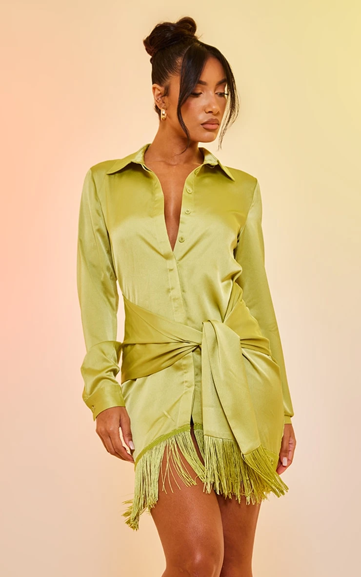 Make a statement with this lime satin drape detail tassel hem shirt dress. This shirt dress is made from a lime satin material that will have you feeling luxe all season. With a drape detail and a tassel hem, you will be feeling chic at your next upcoming event. Team with some clear heels and a pair of your fave gold hoops for a look that will make you feel confident, we are obsessed.