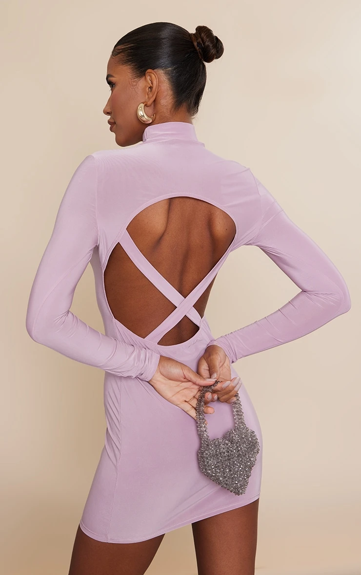 Get ready for the weekend with this mauve slinky cut-out cross-back long sleeve bodycon dress. Made from a mauve slinky material perfect for showing off your unreal figure, with cut-out detail and a cross-back design to add that luxe touch, what more could you ask for? Whether you have a romantic date night planned or a catch-up with the dolls, this bodycon dress is the only choice. Style with a statement bag, clear heels and gold accessories for a flawless finish.