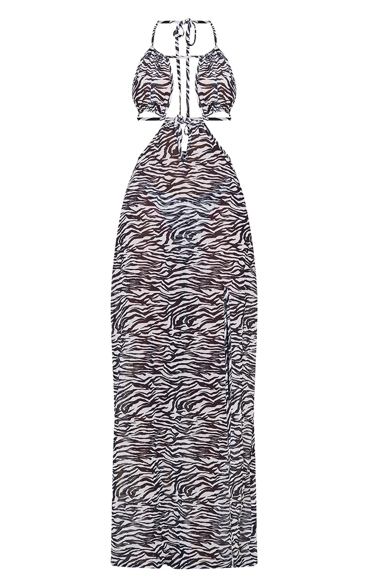 This dress is sure to bring a little attitude to your vacay wardrobe. Featuring a zebra print linen feel material with a cut out design and a maxi length. Style with your fave accessories for the perfect poolside look.