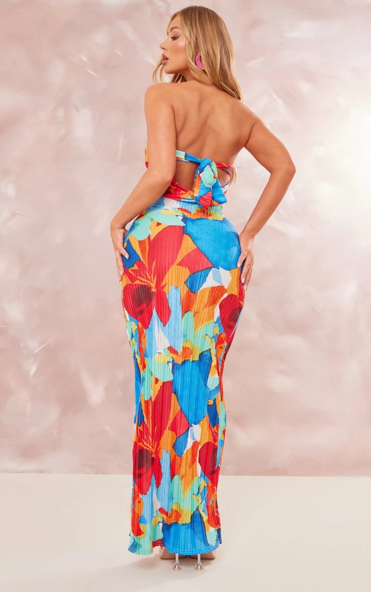 Get ready to show off your glow in this dreamy multi floral abstract print plisse bandeau cowl back maxi dress, you’re sure to have heads turning for all the right reasons. This dress features a floral abstract print plisse material with a cowl back design and a bandeau style, how could you resist doll? Pair this maxi dress with clear slip-on heels and a mini bag for a look everyone will remember.