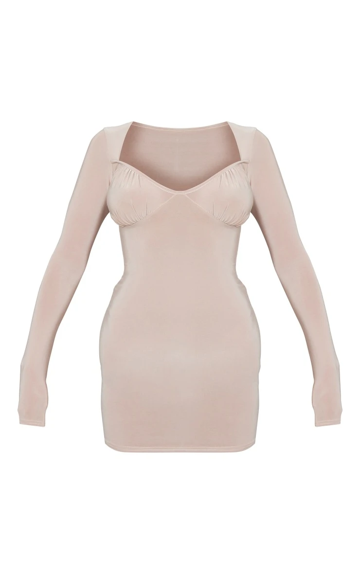 Have all eyes on you in this nude slinky ruched bust long sleeve bodycon dress. In a neutral nude slinky material with a ruched bust design and a figure-flattering bodycon fit, this long sleeved dress is sure to make you stand out from the crowd. Perfect for your next night out with the dolls, we are in love with this bodycon dress. Style with your highest heels, a mini bag and gold accessories for a glam look like no other.