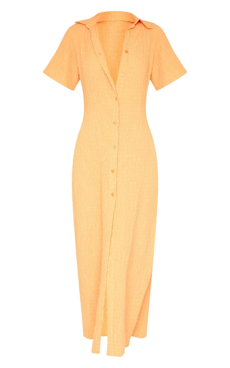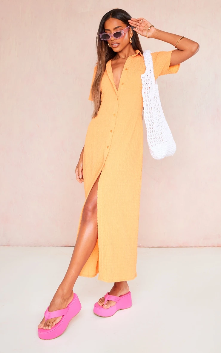 Make them stop and stare with this orange crinkle textured button maxi shirt dress. Swap your usual dress out from this shirt dress doll. With an orange crinkle material for a comfy but chic look, and a button-up fastening, this maxi dress is perfect for your new season wardrobe. Team with some chunky sandals and an oversized bag to complete the look that is perfect for those vacay plans.