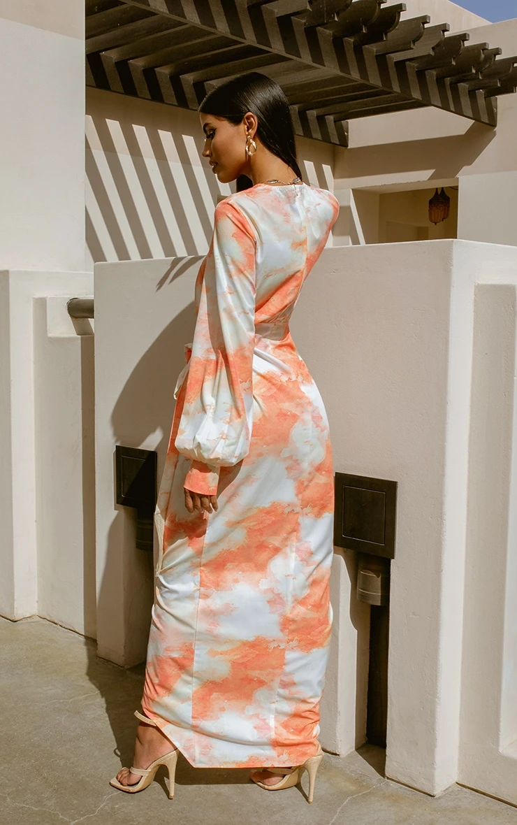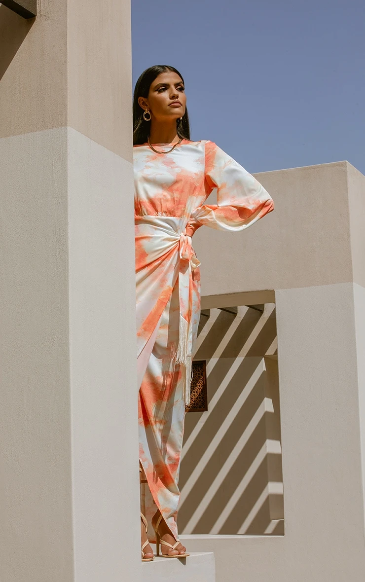 Make a serious style statement in this maxi dress. Featuring an orange watercolour print material with a tassel tie detail and wrap front design. We love this styled with heels to complete the look.
