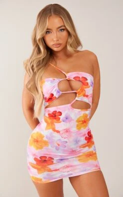 Take on your weekend the right way with this pink floral cut out asymmetric strap bodycon dress. Made from a pink material with a floral design, this is everything we’re loving and more. With its cut out detailing and asymmetric strap, this bodycon dress is sure to hug you in all the right places. To complete the look style this seamlessly with some chunky sandals and your fave accessories for a look that will secure you all the likes.