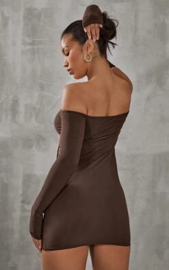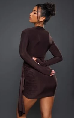 Chocolate Satin Lace Detail Hook & Eye Mesh Sleeve Bodycon Dress
