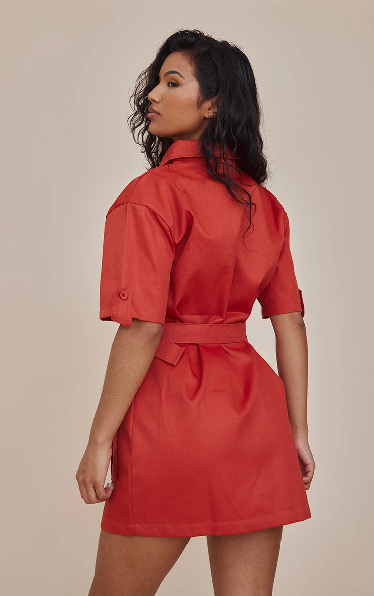 Amp up your style game with this rust cargo shirt sleeve belted shirt dress. Whether you want to switch up your off-duty looks or wanted a chilled weekend vibe this shirt dress is just what you’ve been missing. With a rust cargo material, pocket details, a belt, and shirt design, what’s not to love. For that effortlessly cool off-duty vibe, add chunky trainers, a shoulder bag and staple accessories.