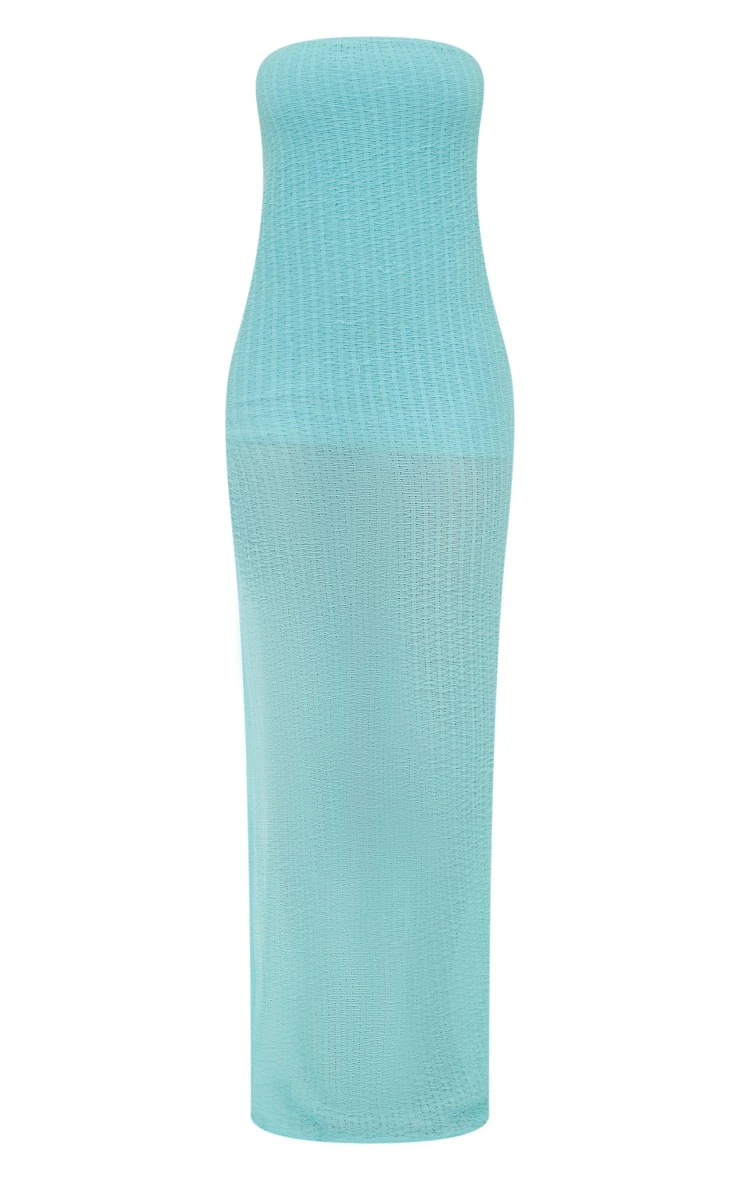 Make a statement this weekend with this sky blue textured bandeau thigh split midaxi dress. Its sky blue textured material adds a luxe touch to your plans whilst its thigh-high split hem expresses your daring side. This midaxi dress is a definite must-have for whatever your plans are and is sure to steal all the stares. Keep this look seriously chic with clear heels and a shoulder bag.