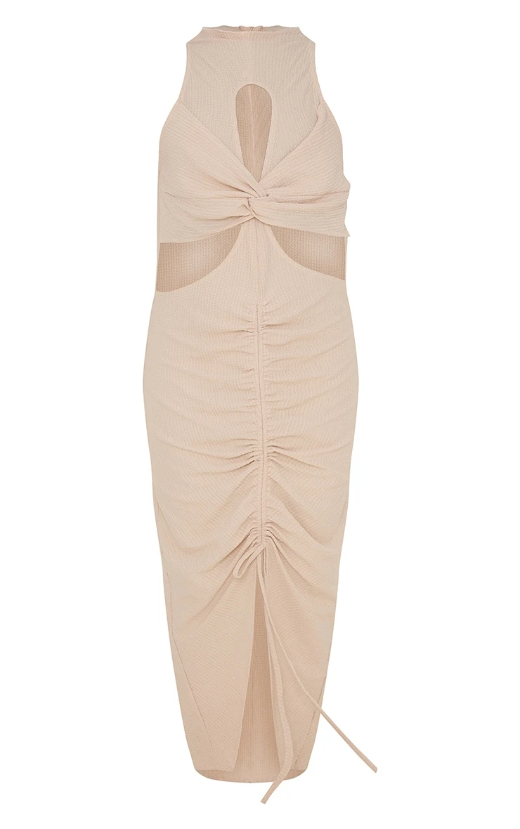 You are sure to be set for all your social plans with this unreal dress doll. Featuring a stone material with a cut out knot detail, ruched front and midi length, what’s not to love? The look can’t go ahead without a staple pair of shoes and gold accessories.