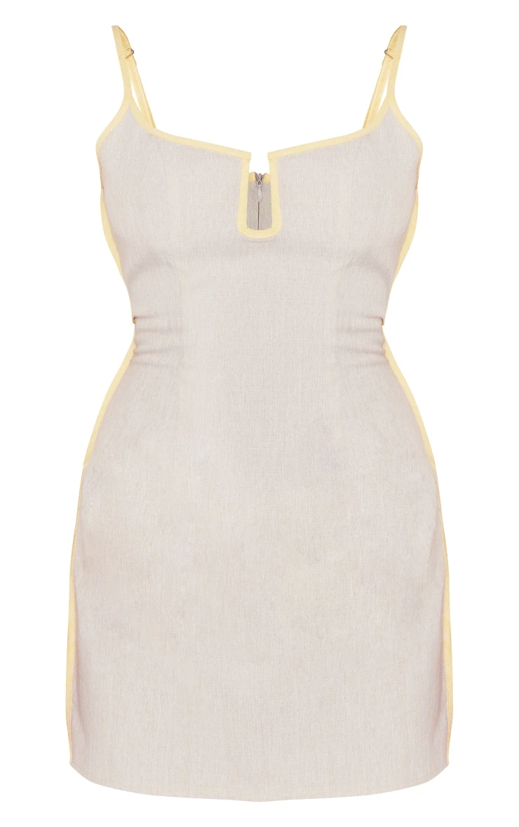 Make a statement this season with this stone line look v bar contrast seam strappy bodycon dress. This unreal dress is sure to solve all of your ‘what to wear dilemmas’. With a stone linen look material that will steal all the stares, and a v bar detail, you will be feeling effortlessly chic. With a contrast seam and a bodycon fit, we are obsessed. Team with a statement bag and your fave pair of heels, its a yes from us.
