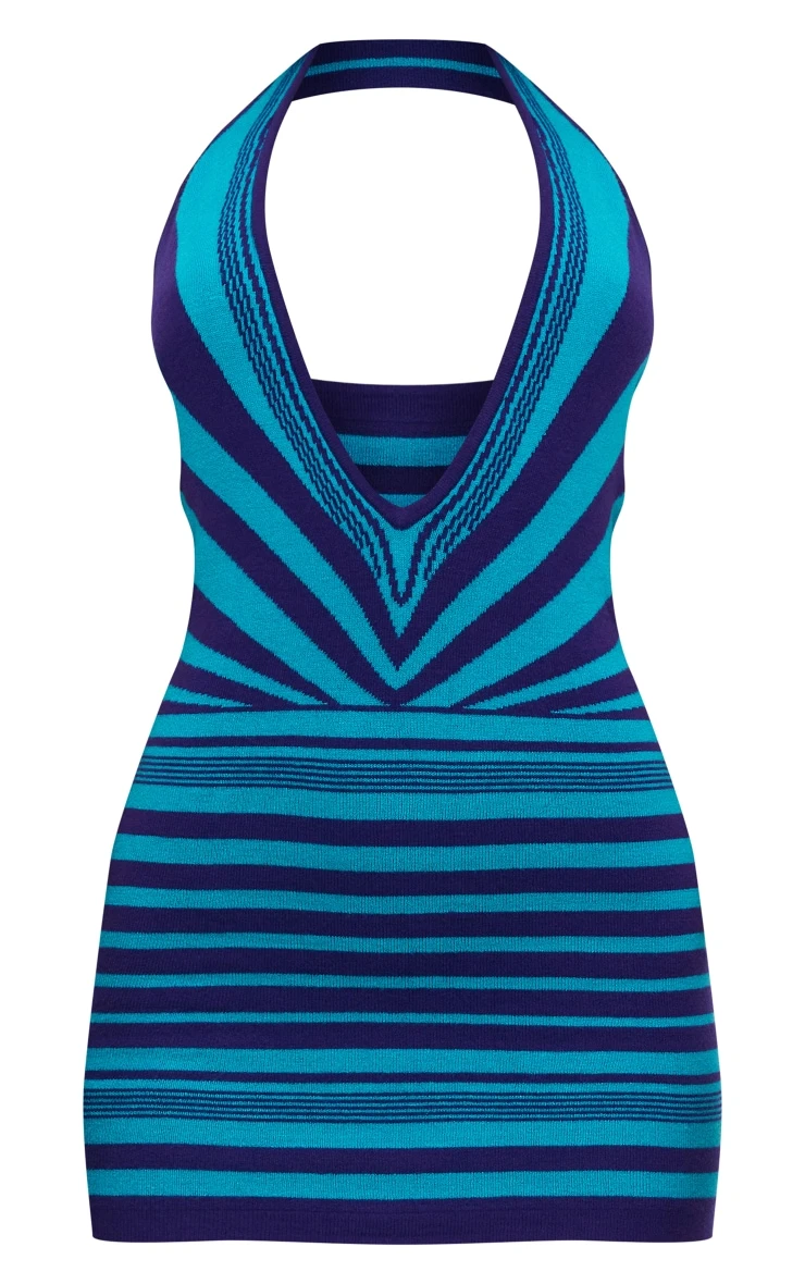 Stand out from the crowd with this turquoise two tone abstract stripe knit plunge dress. We know this piece will earn you all the right attention. Made using a knit material with a two tone turquoise hue, a stripe print and a plunging neckline for some extra attitude, what more could you ask for? This daring piece is sure to earn you all the likes. Wear with knee high boots and simple accessories for a look that will make heads turn.